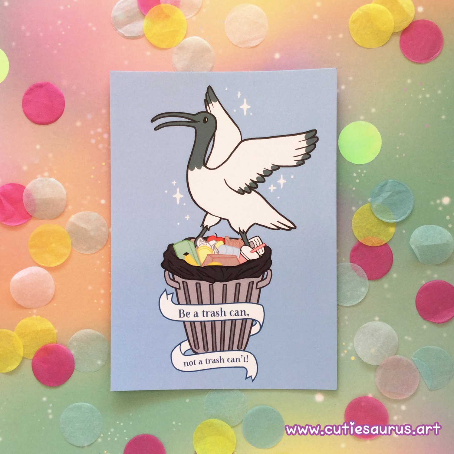 A postcard sized print of an ibis, here to motivate you to be a trash can - not a trash can’t!