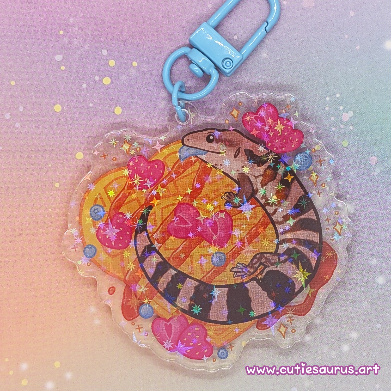 Acrylic keychain of my sweet pet blue tongue lizard named Waffles sitting on some waffles!